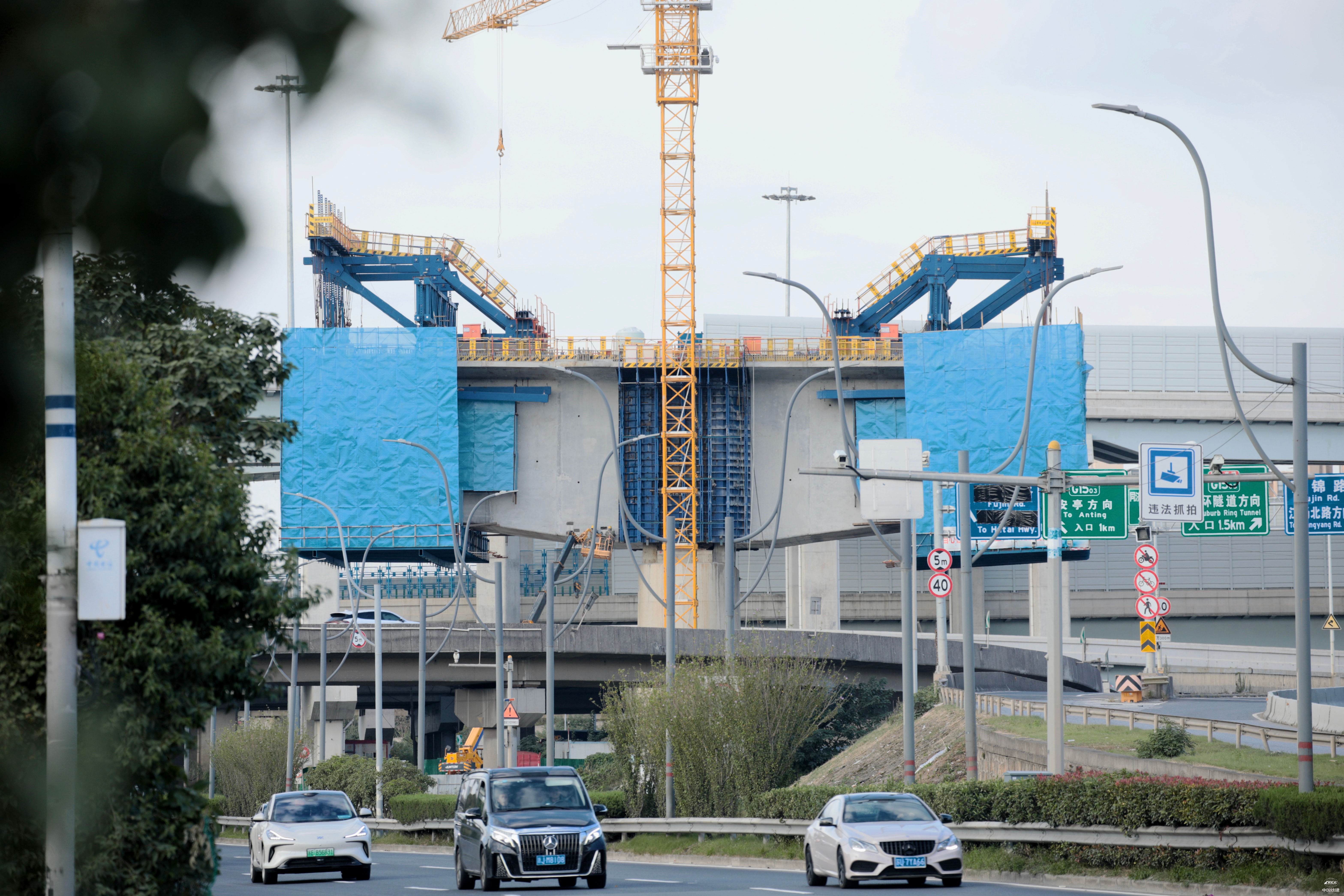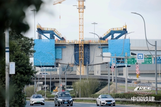 中铁十五局五公司沪渝蓉铁路项目位于上海市宝山区,线路全长6.6千米,主要工程量包括沪渝蓉和沪通Ⅱ期项目,共设连续梁14座。本次完成浇筑的为其中一座特殊三线(72+122+72)米连续梁,位于沪渝蓉34#至37#墩段,横跨蕰川公路与富锦路,采用5.5米-6米大节段,是全线关键控制性节点。桥梁主体最大建筑高度9米,其中1号块长5.5米,宽19.3米,采用挂篮悬臂浇筑工艺,两端对称一次性浇筑C55耐久性混凝土516方,单侧重量高达686吨,是常规双线梁的2-3倍,传统挂篮难以承受。施工区域环境复杂,涉及与在建盾构隧道并行施工、跨越城市主干道及临近众多地下管线,集“大跨度、重荷载、高风险、高精度”特征于一体,对施工精度与综合管控提出极高要求。
