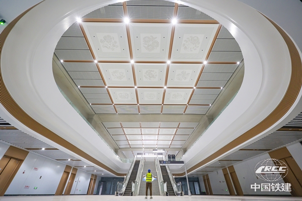 在出站换乘层,团队巧妙融合传统与现代——7组九宫格造型的“山茶花”藻井天花悄然绽放。穿孔铝板的金属质感与中式藻井的古韵相得益彰,仿佛山茶花在站房内盛开。这一设计既传承了巴渝文化,又赋予了空间现代美感。